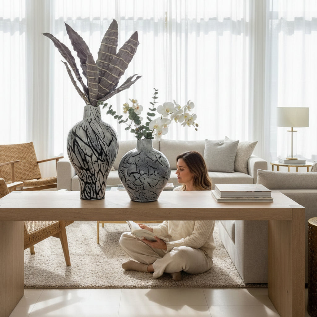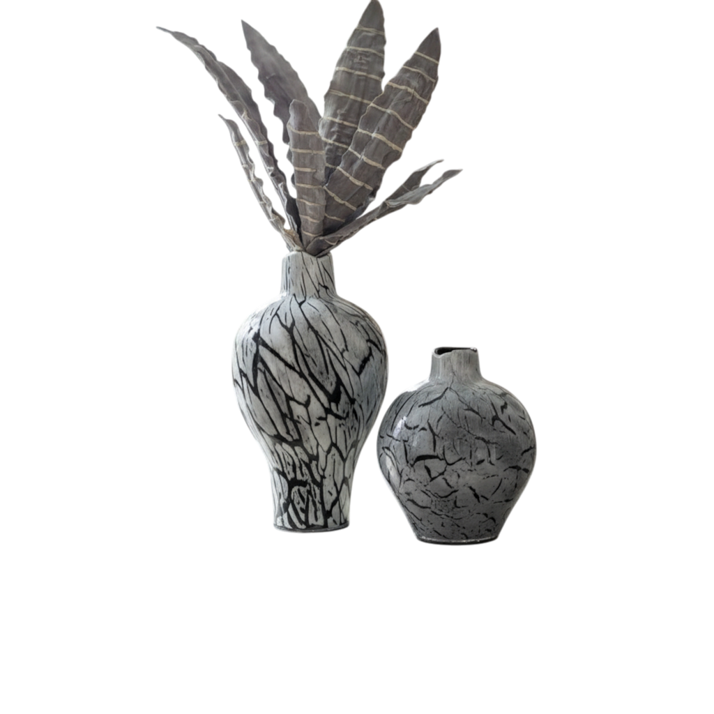 “Elevate your décor with this striking vintage heavy glass vase, featuring a sophisticated blend of black and grey hues. Its substantial weight and artisanal craftsmanship give it a timeless, elegant presence—perfect as a centerpiece or a statement piece on a shelf. Ideal for fresh blooms, dried arrangements, or simply as a decorative object, this vase combines classic charm with modern versatility.
