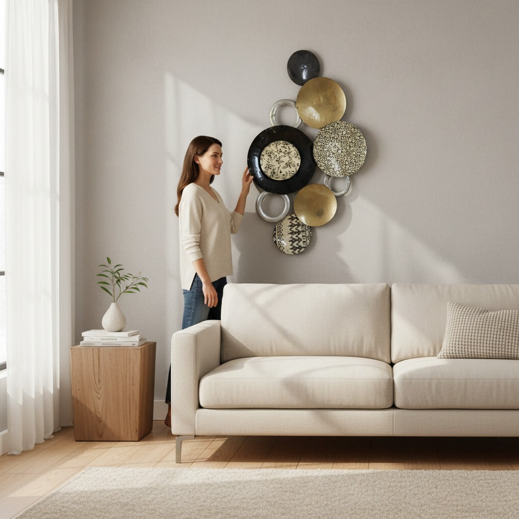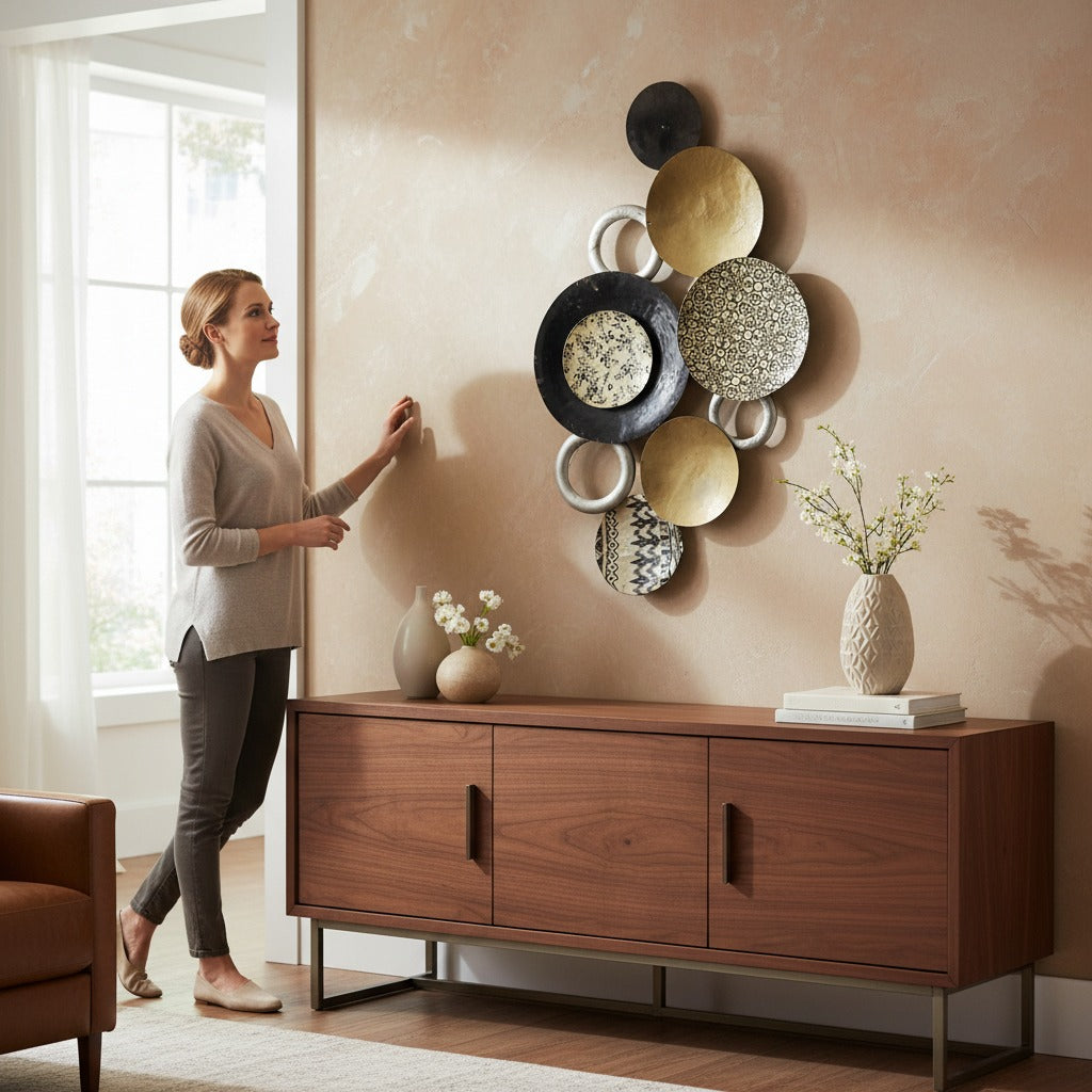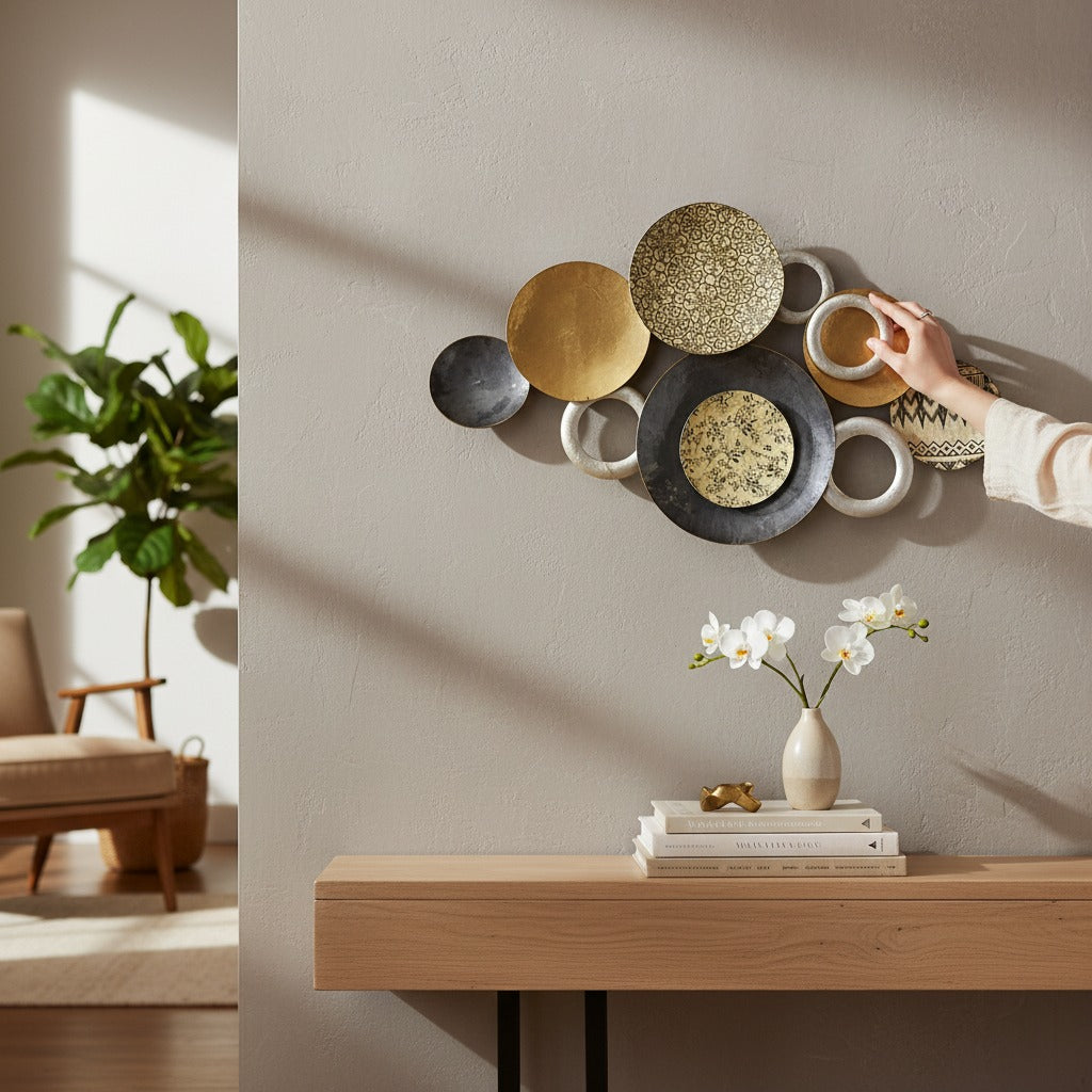 The Antique Aura Handcrafted Brass Wall Art showcases detailed traditional design with a rich vintage brass finish. This elegant wall hanging brings depth and cultural beauty to any interior. Perfect for homes, hotels, restaurants, and ethnic décor themes.