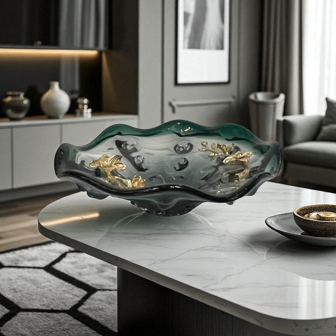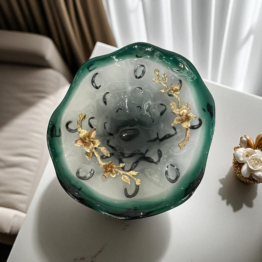 This graceful glass bowl features an organic, freeform silhouette with gently undulating edges, echoing the natural beauty of a flower in bloom. Rendered in deep emerald green with delicate golden floral accents, it exudes both artistry and refinement. The textured surface adds depth and dimension, while the shimmering gold details elevate its elegance.