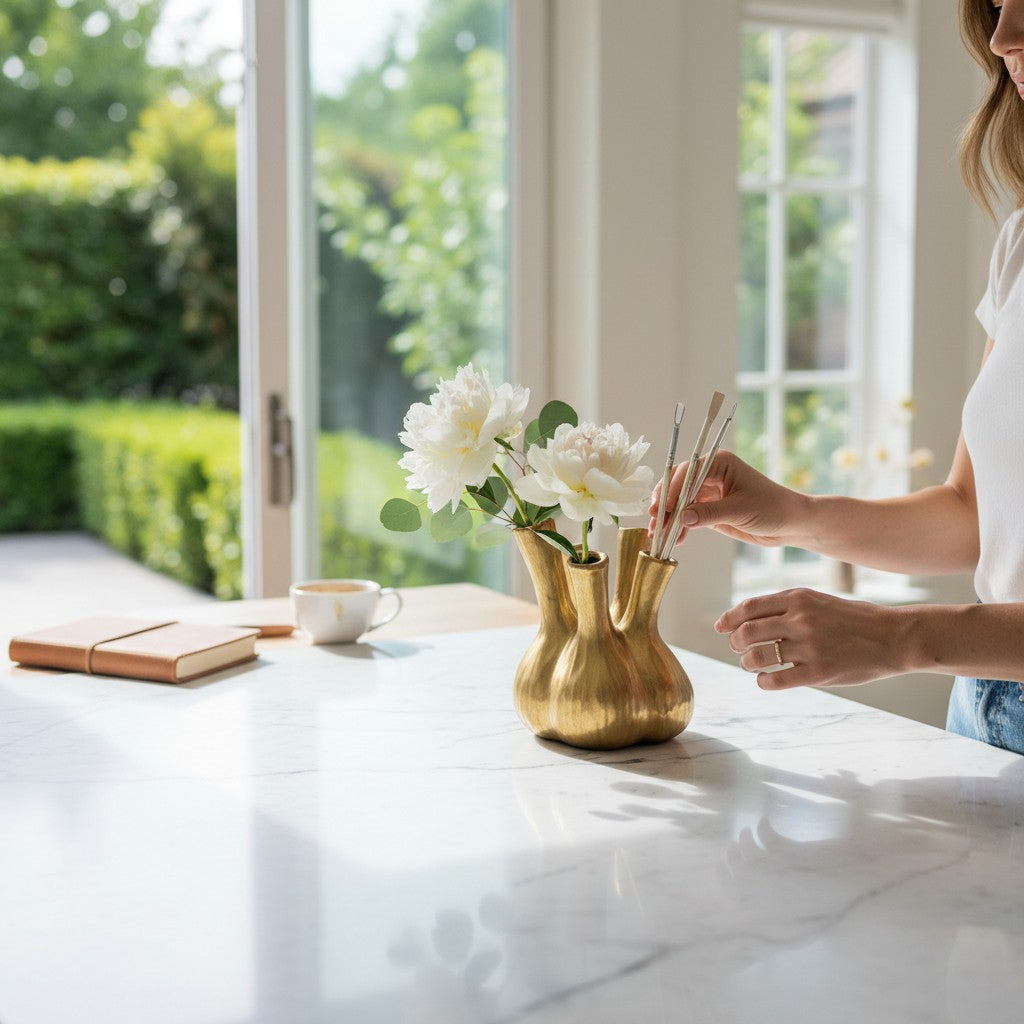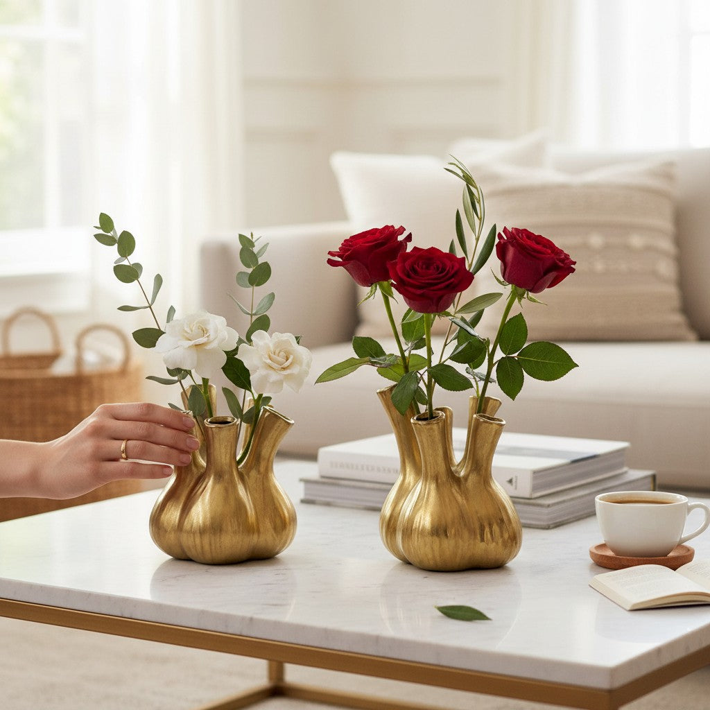 The "Golden Radiance Brass Vase" is a striking embodiment of elegance and timeless beauty. Crafted from high-quality brass, this vase gleams with a warm golden hue that enhances any floral arrangement or stands beautifully as a statement piece on its own. Its sleek, modern design with classic contours makes it a versatile addition to any room, from contemporary living spaces to traditional interiors. Whether placed on a mantel, dining table, or console, the Golden Radiance Brass Vase adds a touch of luxury and sophistication to your home decor. A perfect piece to elevate the ambiance of any space, it also serves as an exceptional gift for special occasions.
