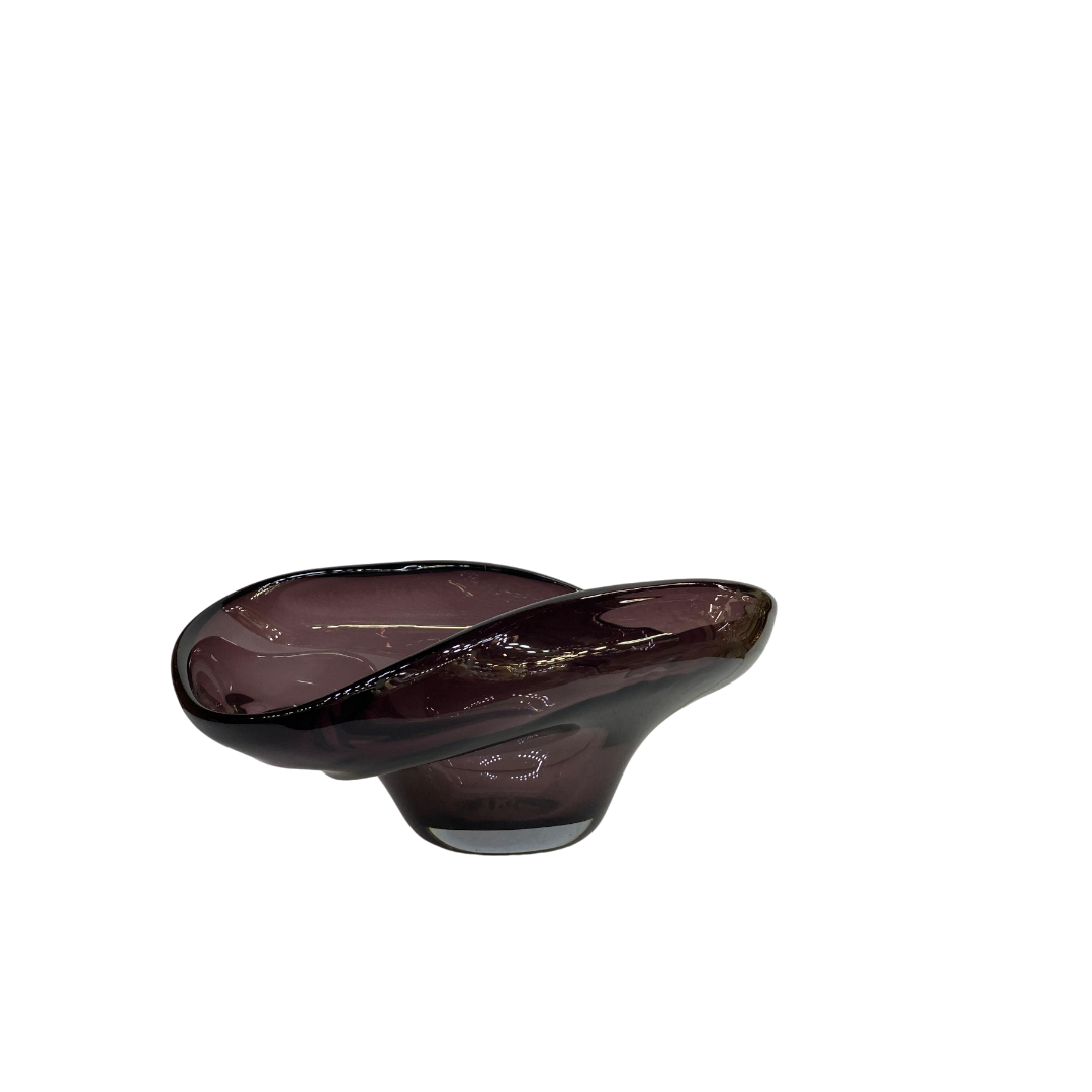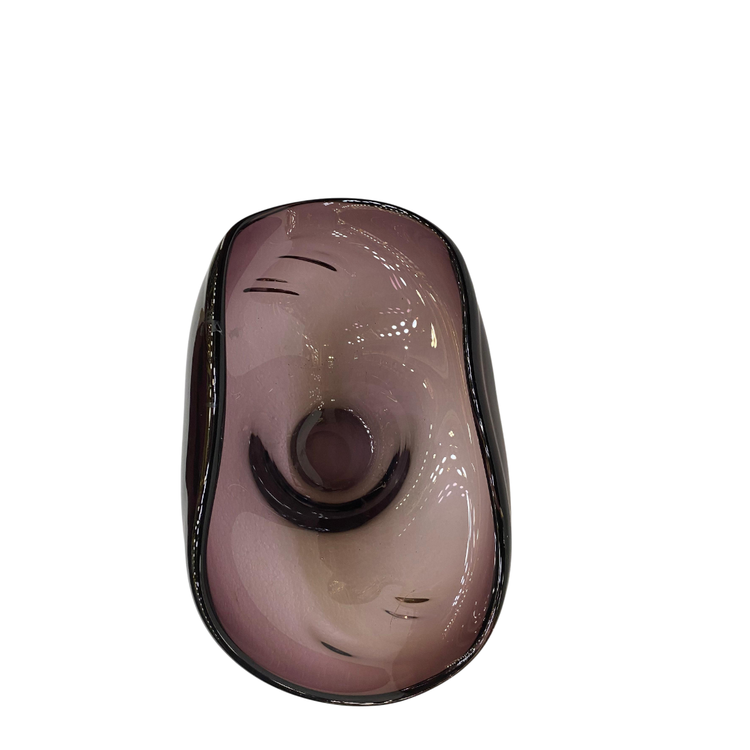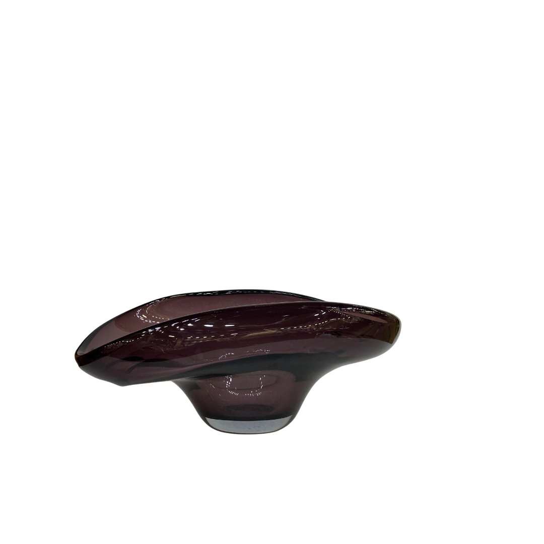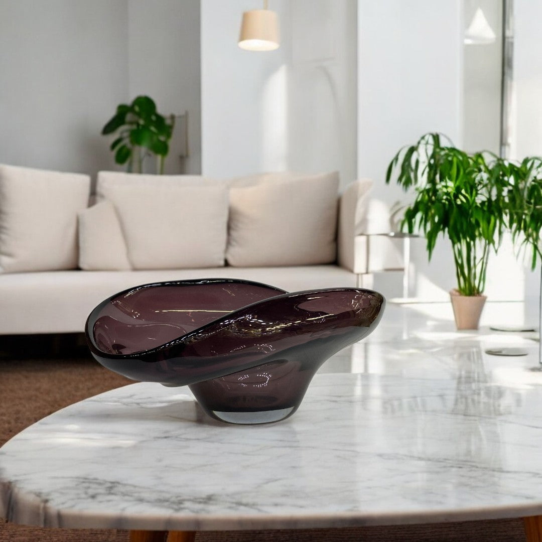 A luxurious handcrafted Italian glass bowl in a rich amethyst hue, showcasing elegant curves and substantial weight that speak to its high-quality craftsmanship. The deep purple tones and glossy finish create a striking visual presence, making it an ideal statement piece for any table or display. Both decorative and sophisticated, this art glass bowl embodies timeless Italian elegance and artistic refinement.