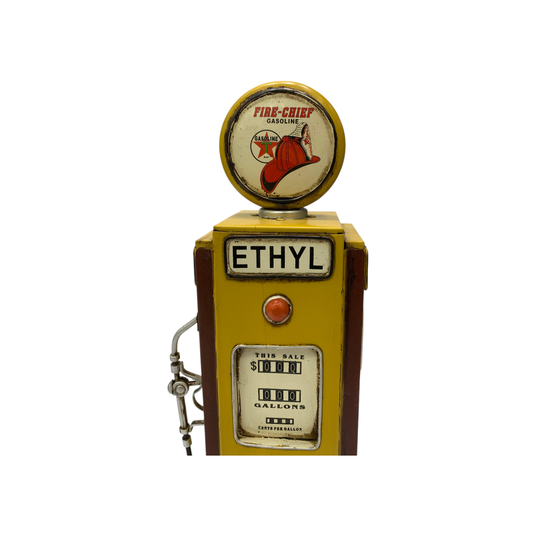 The Metallic Vintage Gas Pump Model is a nostalgic collectible that recreates the charm of classic service stations. Designed with a bold yellow finish, retro fuel company logos, and a detailed meter display, it captures the look of early 20th-century fuel pumps. The model also includes a realistic fuel nozzle and hose, enhancing its authenticity. Perfect for automotive enthusiasts, collectors, or as a decorative piece, this model symbolizes the golden age of motoring and roadside Americana.