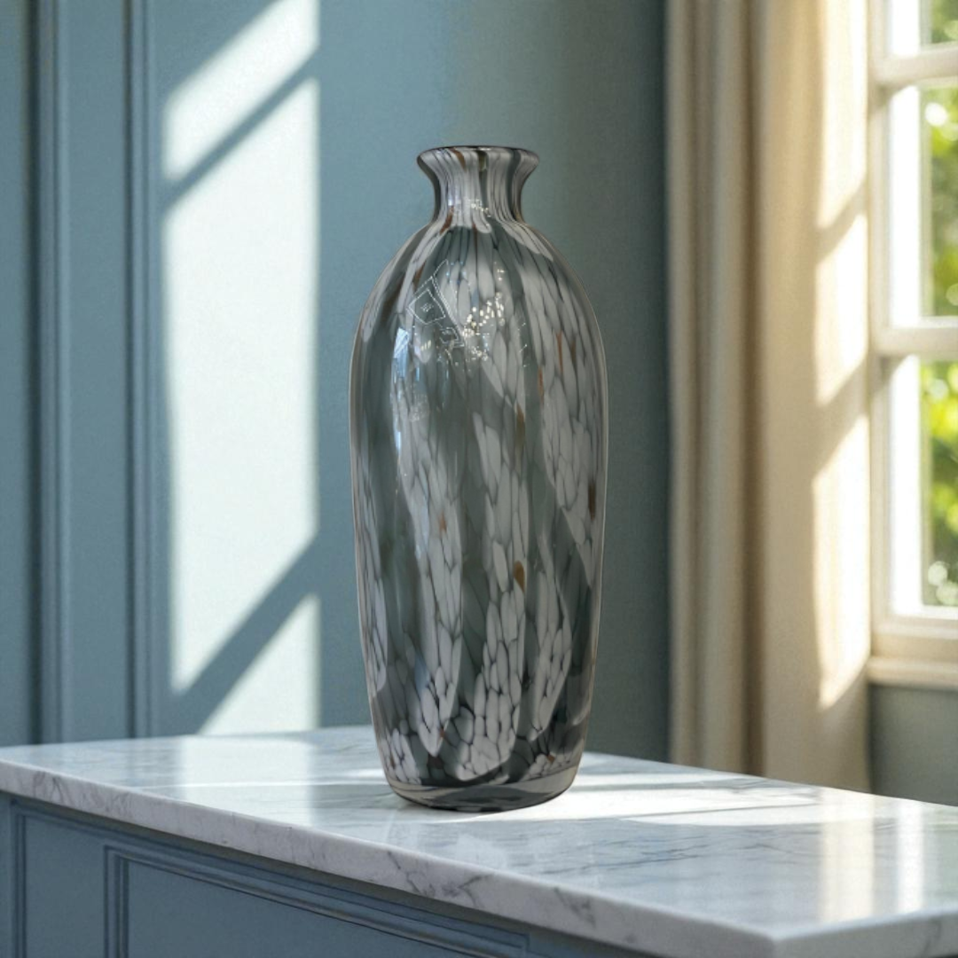A sophisticated set of three glass vases featuring elegant blue-gray hues and captivating swirl patterns. The collection includes a round squat vase, a short bulbous vase, and a tall slender vase, each showcasing unique artistic textures. Perfect for enhancing modern interiors with subtle color and refined craftsmanship.