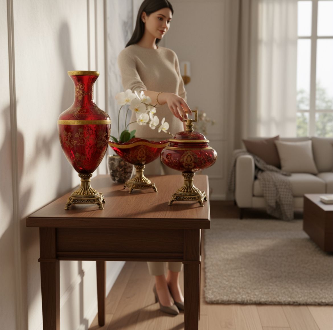 Together, these three pieces embody a perfect harmony of classic European artistry and luxury-inspired design, making them suitable for both traditional and contemporary interiors. Their vibrant red tones and golden highlights infuse warmth and opulence, ensuring they become eye-catching additions wherever placed — from living rooms and dining halls to formal entryways.