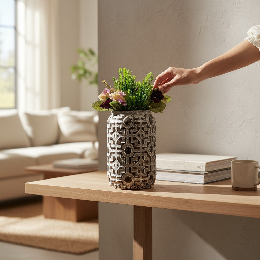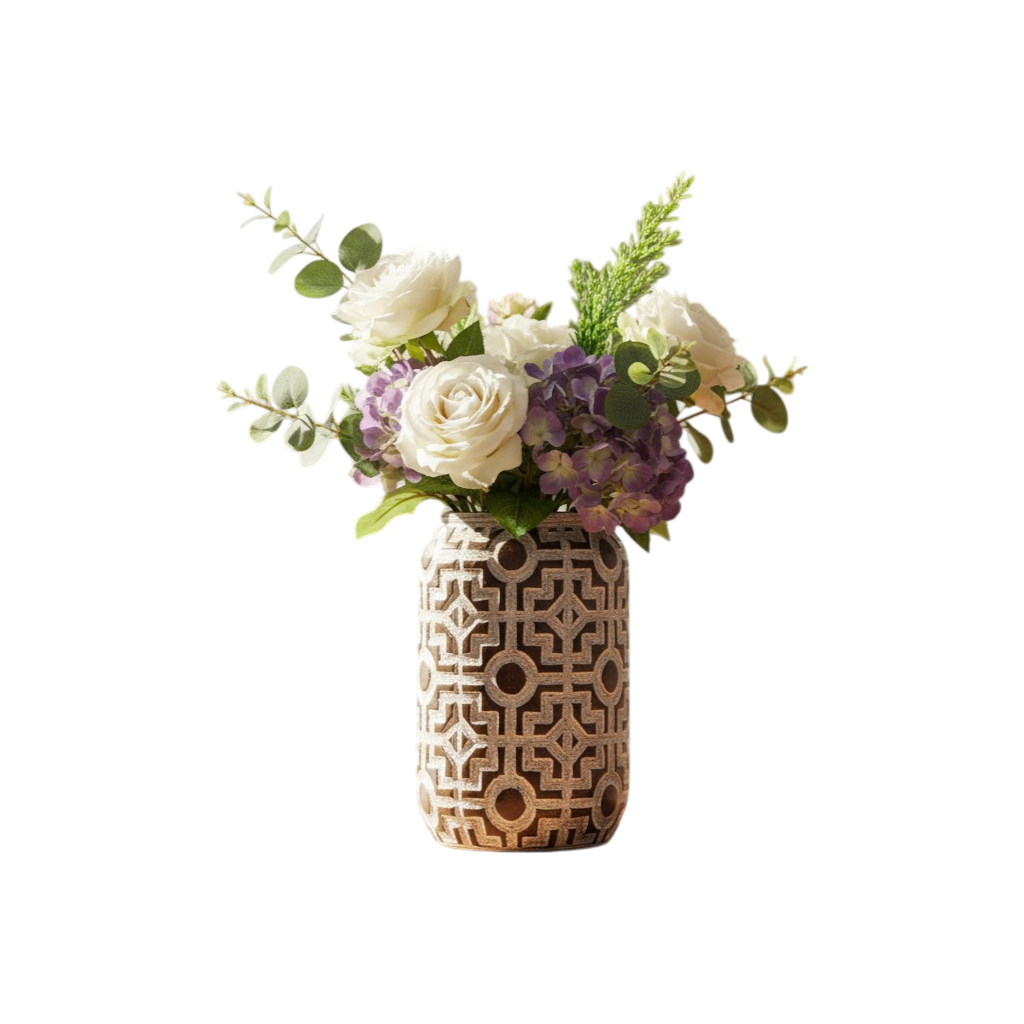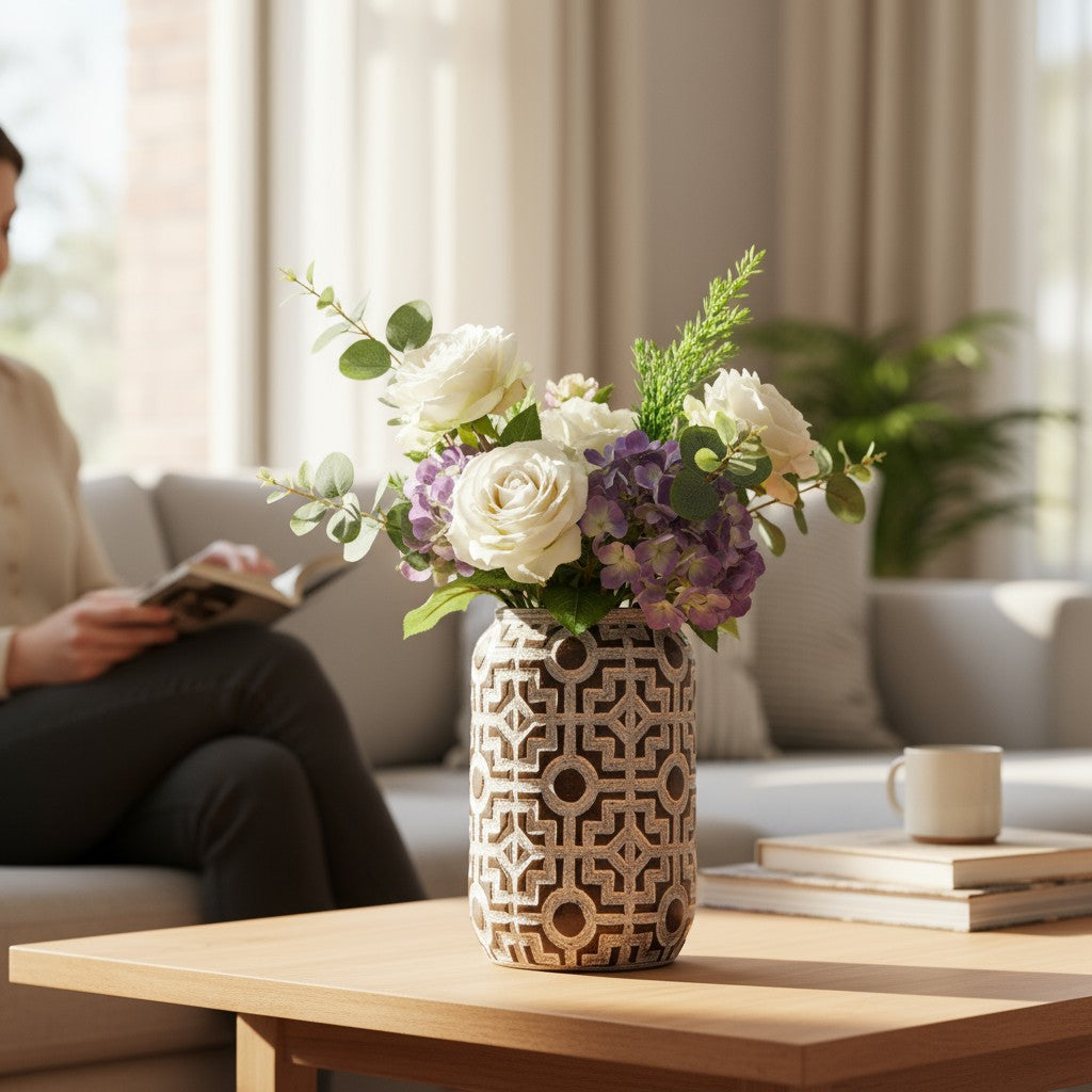 The Whispering Petals Floral Vase is a study in grace and delicacy. Crafted from smooth, ivory-toned ceramic, its minimal design is elevated by the soft pink and orange blossoms that rise like whispers of spring. The piece evokes serenity and refinement, making it an ideal accent for both modern and traditional interiors. Whether placed on a mantel or used as a centerpiece, the Whispering Petals Vase transforms any space into a sanctuary of gentle beauty and peaceful warmth.